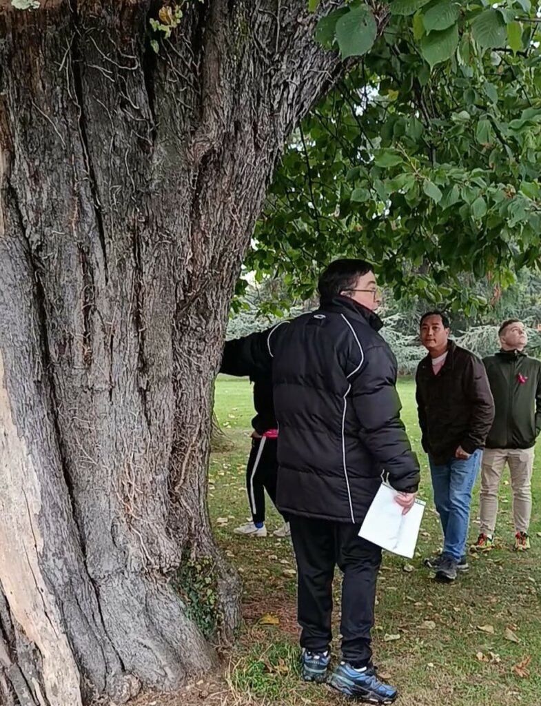 La promenade pédagogique, voulue par Alliance et par Dominique Giraud, va se poursuivre avec Christophe Berthet, qui expliquera les risques qu’entrainent la présence de cet insecte « le Grand Capricorne » par la ponte de ses œufs, dans l’écorce des chênes. Insecte protégé, reconnaissable à sa belle couleur noire et bleue, mais nocif, par les dommages qu’il occasionne sur les arbres majestueux, jusqu’au risque de l’abattage. Mais beaucoup d’arbres ne sont pas soumis aux dommages de cet insecte, tout comme ce séquoia, 4 fois centenaire, dont le branchage se perd dans le bleu du ciel.